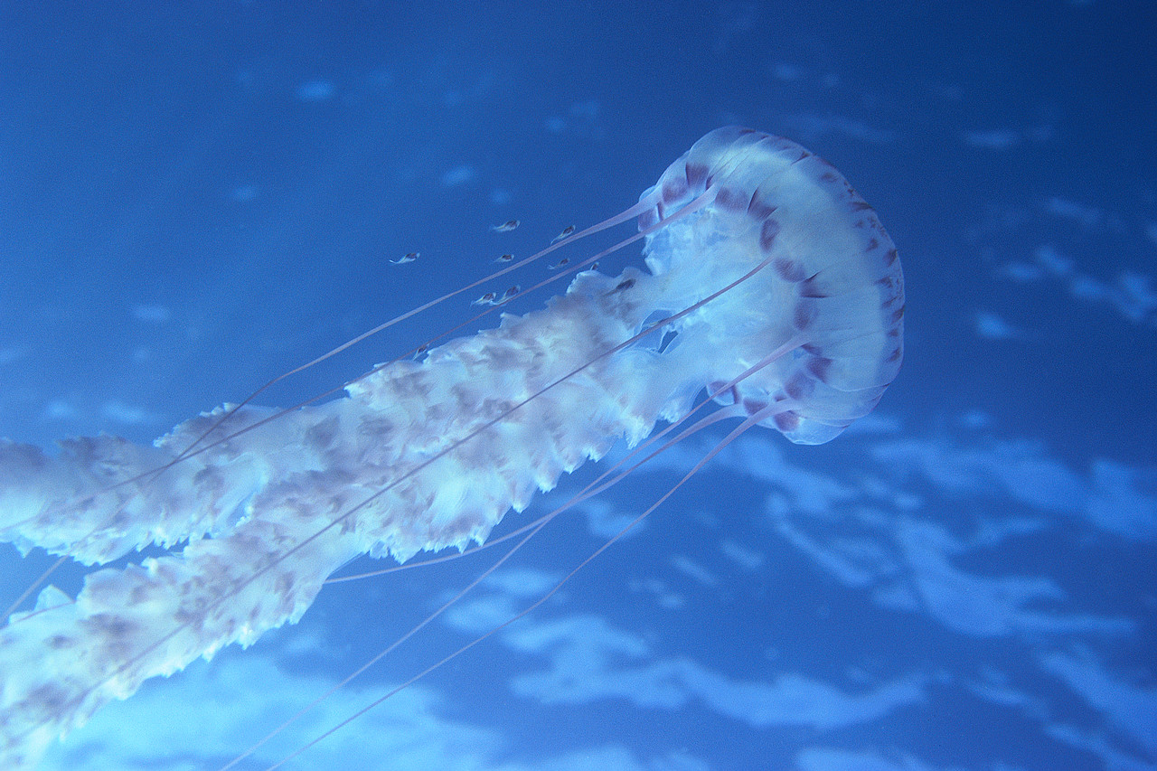 Members of the phylum Cnidaria are incredibly diverse, from the Portuguese man-of-war with its balloon-like float to the giant medusae and corals. The name Cnidaria comes from the Greek word "cnidos," which means stinging nettle. Casually touching many cnidarians will make it clear how they got their name when their stinging cells (cnidocytes) discharge nematocysts equipped with barbs and poison. The cnidarians are the least complex animals with true tissues, but no specialized organs. The over 9,000 species are nearly all marine, distributed from the surface of the ocean to the bottom and from the tropics to the poles; there are only a few freshwater species.