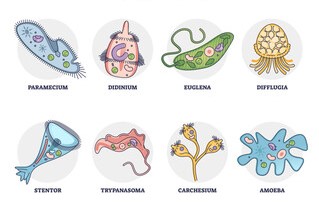 Protozoa are unicellular, heterotrophic, eukaryotic organisms that are found worldwide in most habitats. Most protozoans are free living, but some species cause major human parasitic diseases such as malaria, African sleeping sickness, and amoebic dysentery.