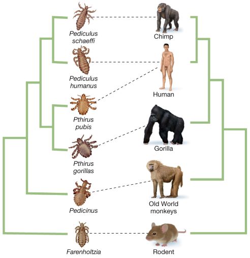 We are developing a better understanding of how our species has been involved in coevolutionary associations with parasites such as bedbugs, tapeworms and lice. Many of these associations appear to be very old. Bedbugs were likely acquired from bats and evolved to become hominin-specific pathogens before the divergence of Homo sapies from other hominins. Hominids appear to have acquired tapeworms long before the origins of Homo sapiens, perhaps due to the shift to a meat-based diet. Humans subsequently transmitted their tapeworms to the domesticated pigs with which we associate these paraites, rather than vice versa as previously believed. Because two ecological types of the human louse Pediculus humanus—head lice and clothing lice (or body lice)—diverged between 83,000 and 170,000 years ago, researchers have hypothesized that humans first began wearing clothes during that time window. Pubic lice (Pthirus pubis) did not speciate on their human hosts but instead jumped to humans from gorillas about 3.3 million years ago, long after the divergence between their hosts (humans and gorillas diverged ~7 mya). (Reed et al., 2007).