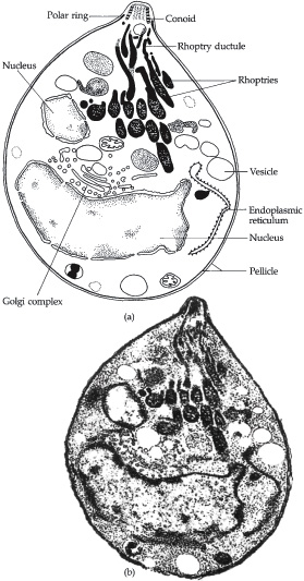Apical complex (a) Drawing of merozoite of Toxoplasma gondii showing details of the apical complex (b) TEM from which (a) was drawn