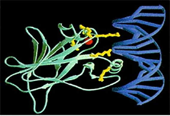 | The structure of the core domain of the p53 protein (green) bound to DNA (blue). The 6 most frequently mutated amino acids in human cancers (yellow)—all are important residues for P53 binding to DNA. The red ball is a zinc atom. |