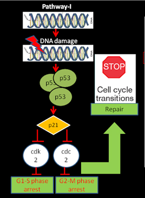 The p53 protein initiates two different responses to DNA damage: arrest of the cell cycle followed by DNA repair, or apoptosis and cell death if DNA cannot be repaired. Each of these responses is accomplished by p53 acting as a transcription factor that stimulates or represses gene expression.